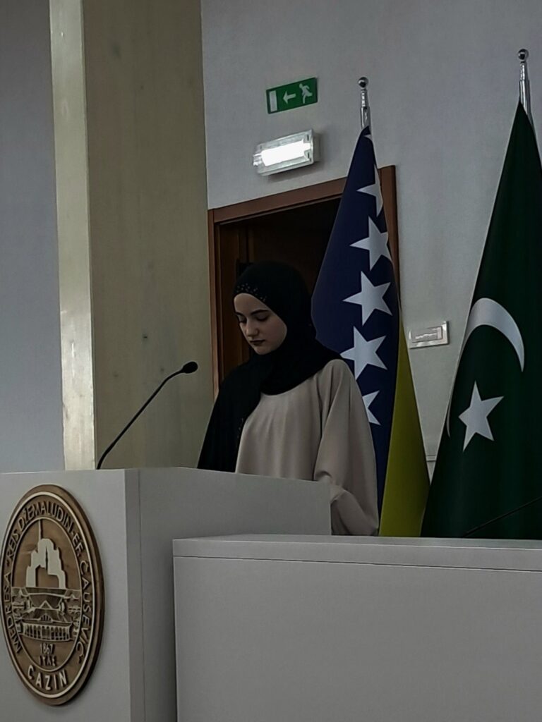 Program obilježavanja započet je učenjem odlomka iz Kur’ana, a.š. Prije prigodnog obraćanja, učenjem Fatihe prisjetili smo se svih naših šehida, kao i šehida Gaze i Palestine, jer Bosna zna šta je bol, ali zna i šta je nada. Na početku programa prigodnim govorom prisutnima se obratio prof. Mehmed Mašić, istakavši važnost arapskog jezika u očuvanju vjerskog, kulturnog i obrazovnog identiteta, kao i njegovu ulogu u razumijevanju Kur’ana i islamske tradicije. U nastavku programa učenici su kroz priče iz bogate arapske književnosti, poput djela “Hiljadu i jedne noći”, “Kelile i Dimne”, te mekama – rimovane proze, predstavili moralne pouke, mudrost i životne lekcije koje ovaj jezik nosi. Učenici četvrtog razreda pripremili su i zanimljive prezentacije o arabizmima u bosanskom jeziku, podsjećajući na snažan i trajni utjecaj arapskog jezika na naš svakodnevni govor, kulturu i identitet. Posebno zanimljiv dio programa bio je kviz o arapskom jeziku, u kojem su učestvovali predstavnici razreda, pokazujući svoje znanje, snalažljivost i interes za jezik Kur’ana. Program je dodatno uveličao i Hor naše škole, dok nas je učenica Leena Pilipović počastila prekrasnim izvođenjem arapske pjesme, čime je atmosfera obilježavanja dobila poseban emotivni i kulturni ton. Svaka izgovorena riječ, izvedeni sadržaj i predstavljeno znanje bili su podsjetnik da arapski jezik nije samo jezik prošlosti već i jezik sadašnjosti i budućnosti — jezik koji nas povezuje s Kur’anom, našim korijenima i ummetom širom svijeta. Učenje arapskog jezika ulaganje je u identitet, znanje i duhovnost. Neka obilježavanje Dana arapskog jezika bude poticaj da i dalje njegujemo ljubav prema jeziku Kur’ana, čuvamo njegove vrijednosti i prenosimo ih budućim generacijama.