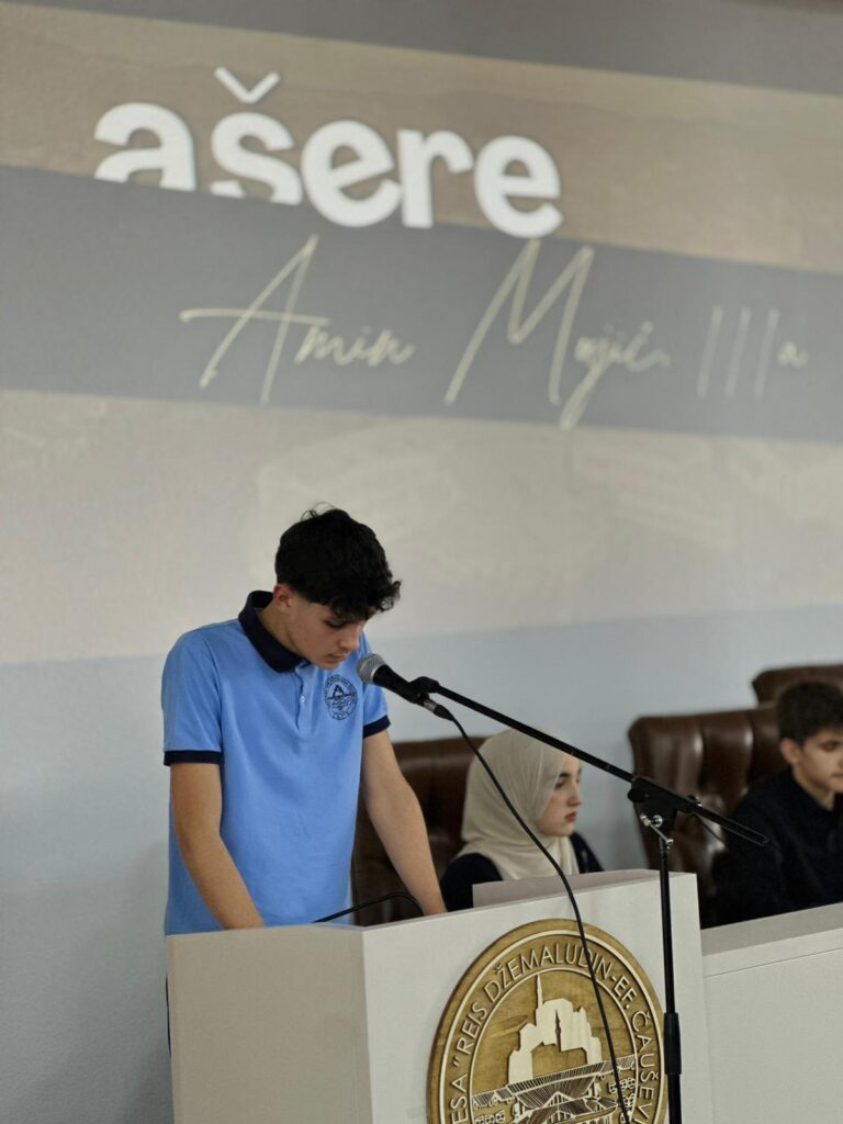 Nakon proglašenja pobjednika i uručivanja prigodnih nagrada, završili smo program sa ašeretom koji je proučio učenik trećeg razreda Nurudin Durić, a profesor prof. Amar Grahović je proučio dovu za našu jedinu domovinu.