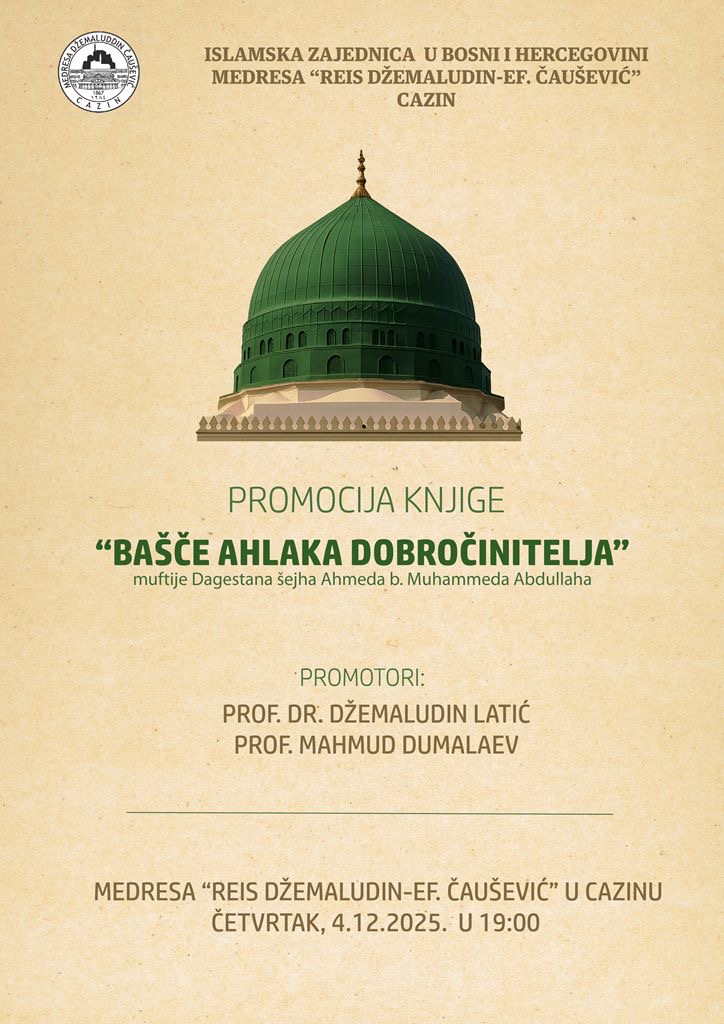 Medresa “Reis Džemaludin-ef. Čaušević” Cazin poziva vas na promociju knjige “Bašče ahlaka dobročinitelja”, djelo uglednog muftije Dagestana, šejha Ahmeda b. Muhammeda Abdullaha. Ova knjiga predstavlja važan doprinos islamskoj misli i etici, kroz prikaz plemenitih karakteristika dobrih ljudi, temeljenih na islamskim vrijednostima i uzorima iz prošlosti.